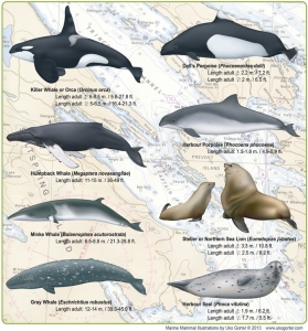 Ranger candidates keep their own Field Journal, a checklist of 12 mammal species seen in the Sound and Straits of this North American Serengeti, from rambunctious sea and river otters, to harbor seals and porpoises, to massive baleen whales like the grays and humpbacks, all the way up to the top of the food chain, the Bigg’s (transient) killer whales and our beloved resident orcas. Eight of the 12 species on the PWWA Orca Ranger checklist must be spotted, confirmed and journaled before the candidate will be certified. Sightings of other, less common marine mammals within the Pacific Northwest may also qualify.